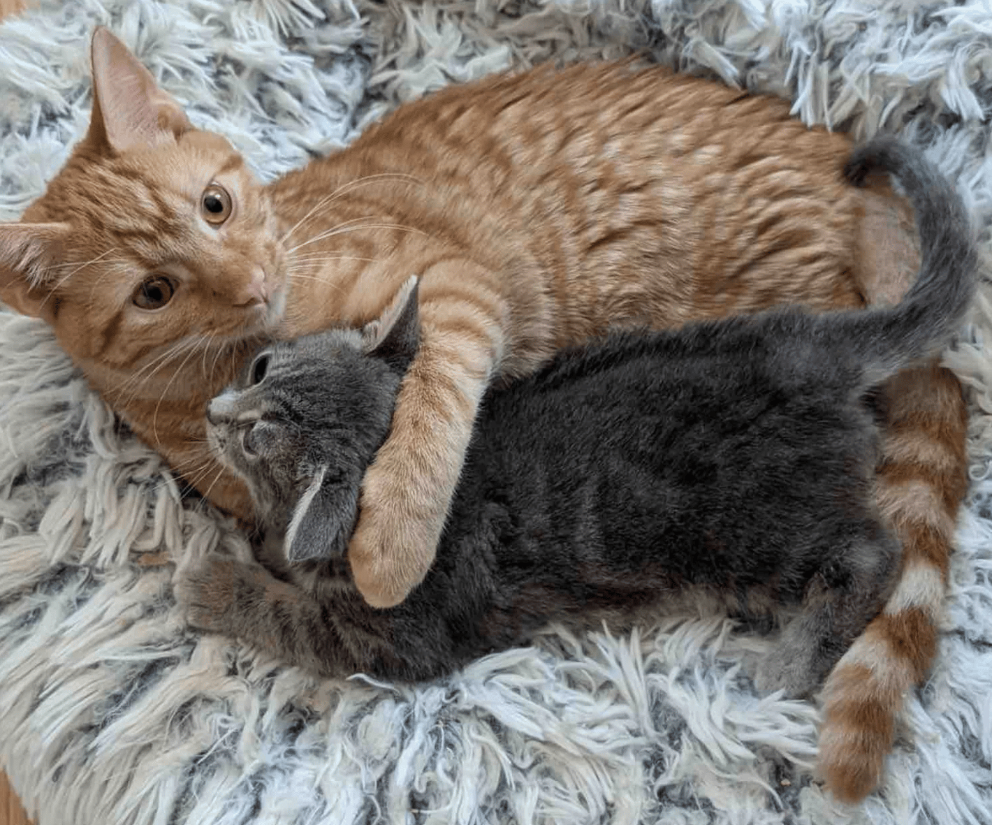 C’est ainsi qu’à trois mois et demi, Schuster avait la taille d’un chaton d’à peine 8 semaines. Mais même s’il était plus petit que les autres, cela ne l’a pas empêché de se trouver un meilleur ami. Nommé Simon Says, ce chat tigré roux était paralysé des pattes arrière.