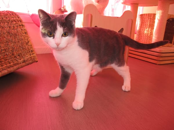 Newt est un chat gris et blanc né le 01/06/2025 (estimation), trouvé seul dans la rue. Il est sociable, calme et assez indépendant. Il est atteint d’ataxie cérébelleuse, ce qui se traduit par des troubles de l’équilibre et de la coordination des mouvements ; c’est en général non évolutif et sans douleur pour le chat qui ne se voit pas comme handicapé. Il est parfaitement autonome pour manger, boire et aller à la litière et fait sa petite vie comme n’importe quel chat dans un environnement adapté. C’est un petit fripon qui aime bien jouer (même seul), surtout avec son tapis d’éveil et sa tente pop-up, investissements indispensables à son épanouissement. Il ne fait pas de câlins pour le moment mais apprécie qu’on lui en fasse. Il aura besoin d’une famille calme et assez présente, il n’aime pas le bruit ni l’agitation. Il vit actuellement avec des chats, il ne recherche pas forcément leur présence mais il est sociable chats ; si animaux ou enfants (pas en bas âge) dans le foyer, ils devront être calmes et très gentils ; de par son handicap, il ne peut pas courir, grimper, se percher pour se mettre en sécurité, ni se défendre contre un quelconque danger. Il ne devra évidemment pas sortir, sauf accompagné d’un humain. Idéalement, pas de sols durs et glissants, ou il faudra prévoir des tapis afin d’amortir les chutes, et pas d’escaliers.