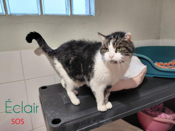Eclair est en SOS par rapport à son âge. Nous lui recherchons un foyer calme, serein et douillet en maison ou en appartement. Il pourra vivre avec d'autres chats et des enfants respectueux.