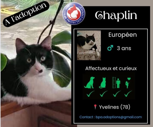 CHAPLIN est un chat calme, affectueux, sa présence apaise.
