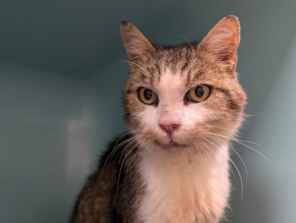 Trouvé errant et jamais réclamé, il s’est révélé être un chat calme, gentil et très affectueux, reconnaissant envers ceux qui prennent soin de lui.