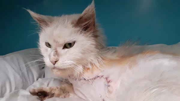 U'Stone a été trouvée gravement accidentée et dans un état lamentable (non soignée depuis plusieurs semaines). Elle a du être amputée de la patte avant.