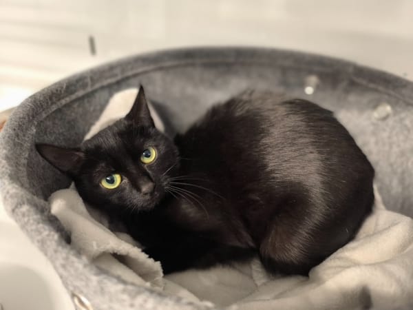 Chafouin vient d'un retrait suite à une enquête. Elle vivait dans de mauvaises conditions avec d'autres chats sans réel contact avec l'humain. Elle a eu des chatons dès son arrivée et a été prise en charge par une de nos familles relais le temps que ses chatons soient assez grands.