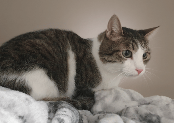 Moustique vient d'arriver au refuge suite à l'hospitalisation de sa propriétaire. C'est un chat très calme et câlin une fois mis en confiance.