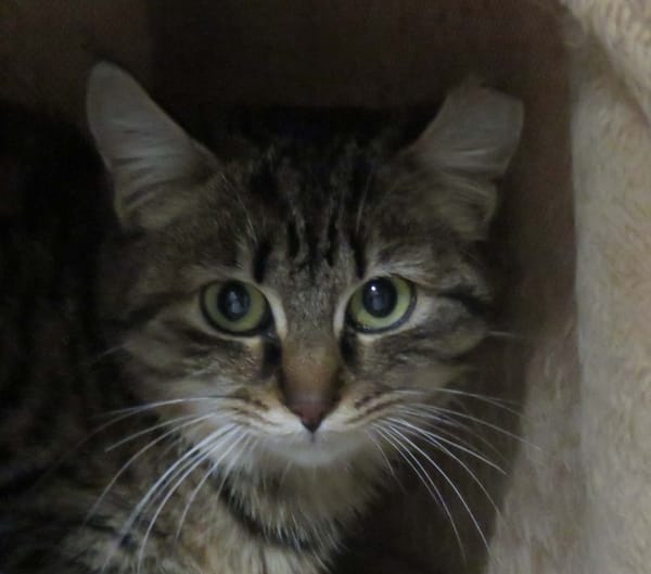 Lavande vient d'arriver au refuge et elle est tout intimidée. Mais dès que nous nous approchons et lui tendons la main, elle fait des câlins et des gros ronrons.