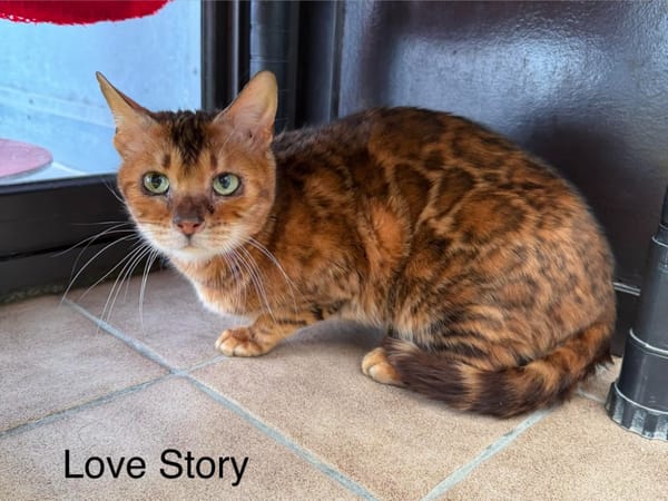 Love Story est une magnifique chatte Bengal arrivée au refuge suite à une cession. Retraitée d’élevage, elle n’a connu jusqu’à présent que la reproduction et découvre aujourd’hui, avec douceur, une nouvelle étape de sa vie.