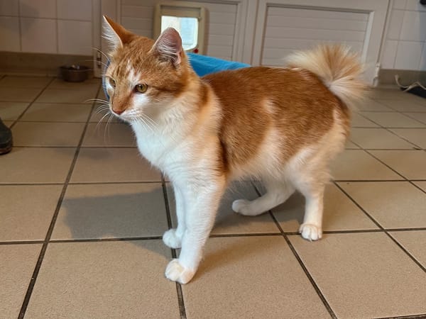 Manx est un jeune chat adorable et un câlin. Sa queue en tire-bouchon va vous faire craquer !