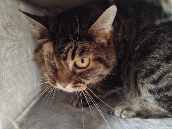 Sympathique chatte borgne qui apprécie les gros câlin, Oria sais tout de même dire lorsqu'elle en a marre.