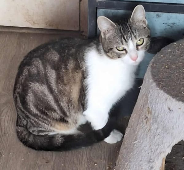 Estimée à 7 mois, elle est craintive avec les humains car elle n'en a pas connu avant. Elle doit apprendre à accepter et apprécier le contact physique, cela prendra du temps il faudra donc beaucoup de patience et s'adapter à son rythme.