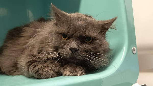 Grigri est arrivé chez nous à la suite d'une cession. Il vivait avec une quinzaine d'autres chats.