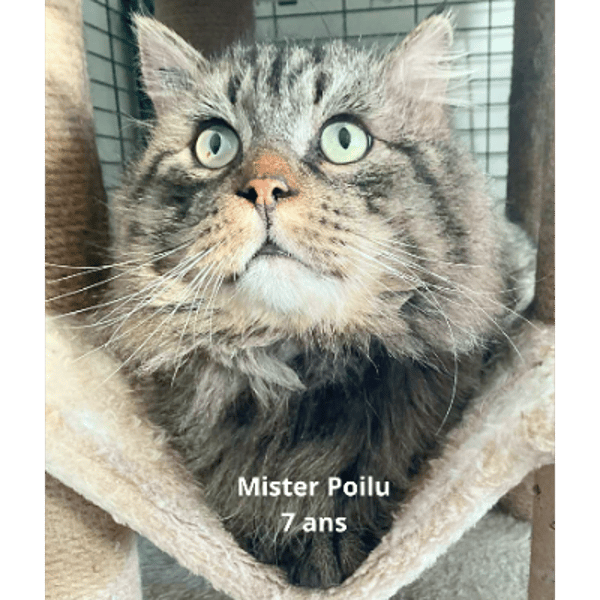 Nous l'avons nommé Monsieur Poilu. Il a environ 7 ans. Avec son beau regard vert persan, il sera vous faire succomber à son charme. Il a aussi une caractéristique adorable : il dit bonjour ou merci en léchant les doigts de son humain. Il ne cherche qu'à recevoir de l'amour et à en donner.