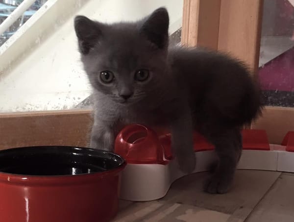 Nous vous proposons à l'adoption ce chaton chartreux au pelage gris de trois mois appelé Marie. Elle est sociable avec ses congénères et proche de l’humain une fois en confiance.