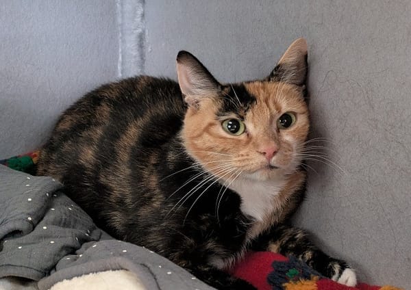 Bella a été abandonnée avec ses chatons au refuge. C'est une minette timide qui se méfie des humains.