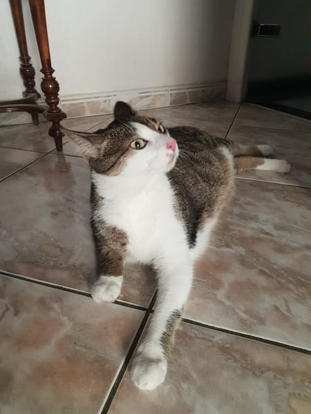 Chat craintif qui découvre pour la première fois un autre univers que le sien et la vie en cohabitation avec un autre chat. Calme, curieux, il s'adapte vite à cette nouvelle situation. Pas du tout agressif, câlin, sociable... Peu actif, il a toujours vécu en appartement, il regarde le jardin avec envie et aimerait sortir (encore trop tôt). Très observateur, il aime suivre et participer aux activités de la maison. Deux sorties jardins, il s'est montré prudent...