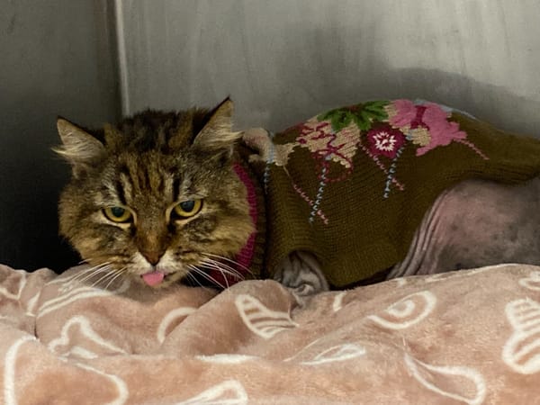 Elle vivait dans la rue et nous a été amenée car des personnes se sont inquiétées pour elle au vu de son âge. Mais Peach est sociable, elle peut vivre au plus proche des humains. On a du la raser car elle était en trop mauvais état. Depuis, elle porte son body avec bonheur.