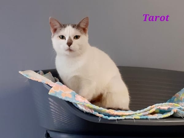 Tarot nous a été cédée suite à l'expulsion de son propriétaire du logement. Elle vivait seule avec son maître en appartement et n'avait pas l'habitude de voir du monde. Elle a dû mal à accorder sa confiance mais une fois acquise elle se montre câline, affectueuse et manipulable.