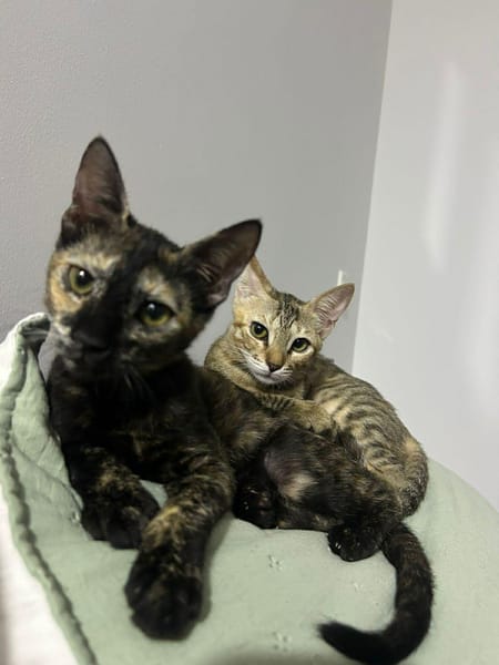 Nous pleurions, affamées, épuisées et terrifiées. La vie était bien trop dure pour de si petits bébés… mais nous avons trouvé une sauveuse. Après une visite chez le vétérinaire, nous avons appris que nous étions en parfaite santé. Nous avons peu à peu appris à faire confiance aux humains, et aujourd’hui nous sommes de vraies boules d’amour : câlines, joueuses et toujours prêtes à ronronner. Nous sommes pleines de joie et d’énergie.