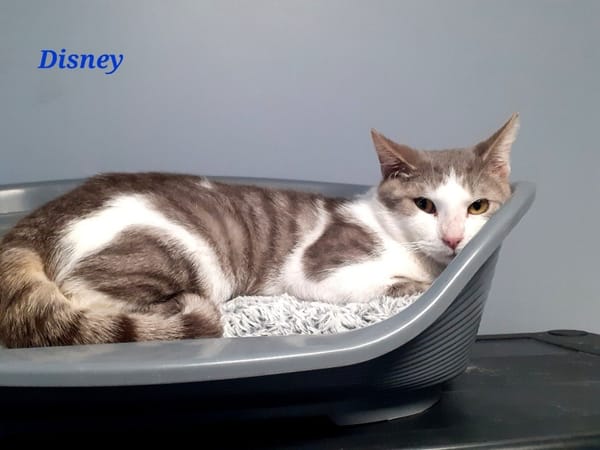 Disney nous a été cédé avec d'autres chats suite à un déménagement. Il vivait en maison avec des chats et des chiens mais ne sortait pas à l'extérieur. C'est un adorable minou, il est un peu timide au premier contact mais il se laisse caresser et une fois en confiance il apprécie le contact et les câlins.