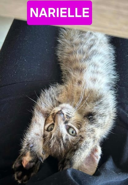 Narielle est une petite femelle tigrée pleine de vie qui a besoin d’attention. Séparée tôt de sa maman, elle est tres proche de l’humain : elle vous suivra partout. Elle aime se blottir contre vous pour des moments câlins et dormir avec vous. Petite charmeuse, elle saura vous attendrir très rapidement.