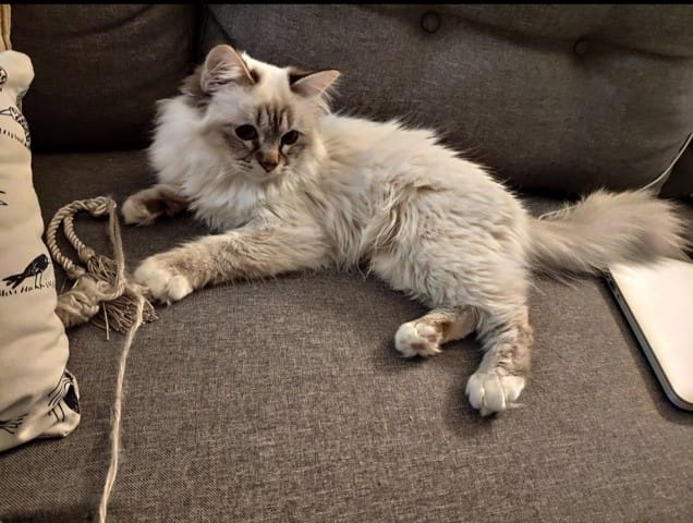C'est un sacré de birmanie élevé en maison avec des propriétaires adorables. Il était entouré de beaucoup de chats. Il a cependant eu un petit souci de santé nécessitant une opération à l'âge de 7 mois. Depuis, il serait devenu un peu plus craintif.