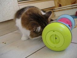 Voici un cas très intéressant, d’une minette séparée trop tôt de sa mère qui recherche le contact lors des repas, comme quand maman chat léchait son chaton quand il tétait ! Le fameux sevrage psychosocial qui fait tant de dégâts. Il vous faut prendre des croquettes plus grosses pour la forcer à mâcher correctement. Le problème des planches à croquettes c’est que le chat comprend vite son fonctionnement, il faut donc en avoir plusieurs et alterner, ou un pipolino. Et surtout, ne la stimulez pas en la grattant, il est clair qu’elle tente de régresser par ce biais.