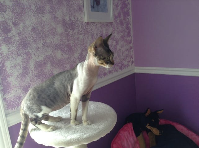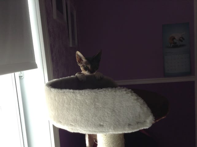 Elle qui découvre son 2 ième arbre à chat ! Elle aime bien le petit aussi, mais je ne peux pas la laisser sans surveillance dedans, car elle me bouffe la partie en osier lol