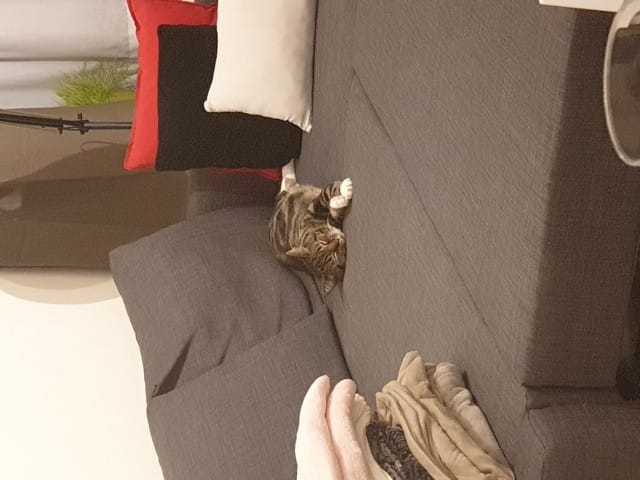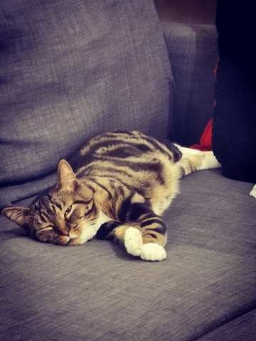 Aujourd'hui il va bien, il dort un peu partout et s'est soigné pour son rhume. Difficile de lui faire avaler ses médicaments, on a du en demander en supplément car il devenait capricieux sur certaines nourritures même ses goûts favoris. J'ai aussi compris que l'herbe à chat ne lui faisait aucun effet par contre la valériane, il adore ! Il joue toujours seul, il reste craintif. Il a fait énormément d'efforts et reste près de nous mais pas possible de le toucher encore. Il aime bien être en compagnie en fait.