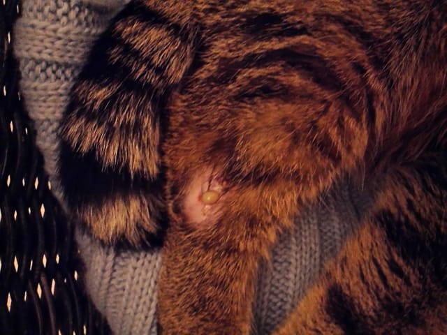 C'est pas très beau a voir. Ton chat a du se faire mordre... Tu devrais l'amener rapidement chez un vétérinaire pour soigner cette infection.