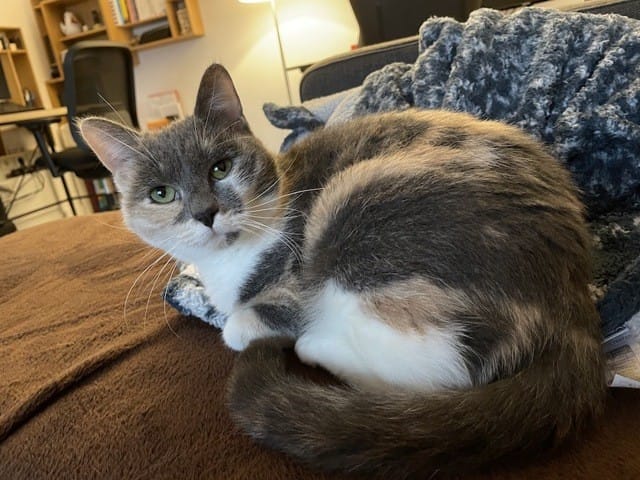 Dès son arrivée à la maison, elle s'est extrêmement bien adaptée. Elle est très curieuse, elle n'est pas du tout restée cachée et adore explorer. Elle est en pleine forme, et elle a l'air super détendue avec nous (contrairement au refuge où elle était enfermée avec d'autres chats qu'elle supportait très mal).