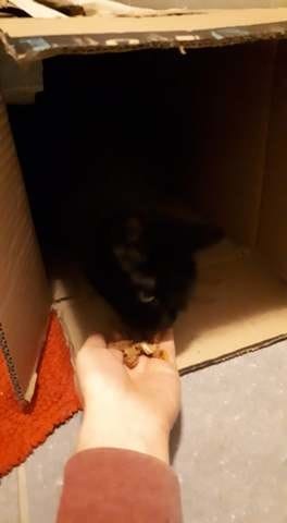 Bonjour à tous, mon compagnon et moi venons d'adopter une petite chatte noire en association, elle s'appelle Drieka et est extrêmement traumatisée. En effet elle a été victime d'un accident qui lui a fait perdre une de ses pattes arrière, puis a été abandonné, adoptée puis re abandonnée, bref elle en a vécue cette petite...L'association ne connait pas vraiment son âge mais elle a aux alentours des 5 ans. Elle est arrivé le 17 décembre 2021, et nous lui avons emménagée une pièce pour elle, avec tout ce qui lui faut, et on lui as mis une construction en carton qu'on avait fait pour nos deux autres chattes afin qu'elle puisse s'y cacher. Depuis 4 jours elle reste dans ce tunnel quand je suis avec elle dans la pièce, je lui parle, reste couchée, essaye de jouer avec elle. Elle n'est aucunement intéressée par le jeu et me grogne dessus si j'approche trop ma main. Cependant hier soir j'ai réussi a la faire manger dans ma main avec de la patée et je pense que c'est bon signe !