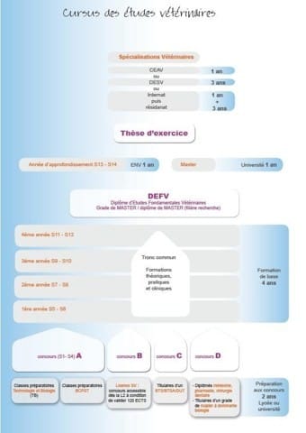 J'ai trouvé un schéma explicatif qui montre le cursus à suivre pour l'entrée en école vétérinaire:il y a un concours qui se prépare apparemment en deux ans après le Lycée ou la Fac...Il est ouvert aux classes préparatoires en Technologie et Biochimie,aux classes préparatoires "BCPST",aux Licences SV,aux titulaires d'un BTS/BTSA et DUT,aux diplômés de médecine,pharmarcie et chirurgie dentaire,et aux titulaires d'un grade de master à dominante biologie...