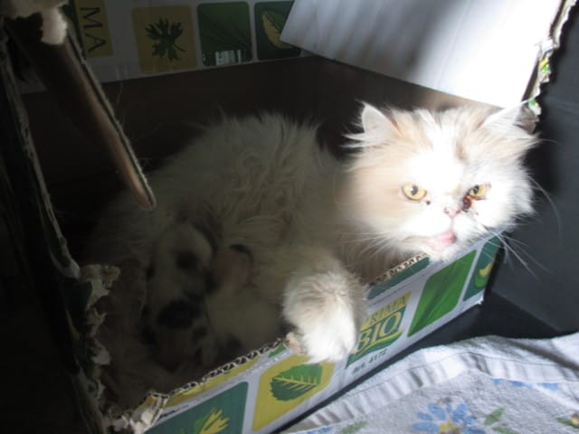 Je participe avec ma petite Loka. Elle est tombé enceintre. Et elle a accouché ce Vendredi 22 mai 2015 :) Elle a eu 4 chatons, mais 1 des chaton est mort :'(