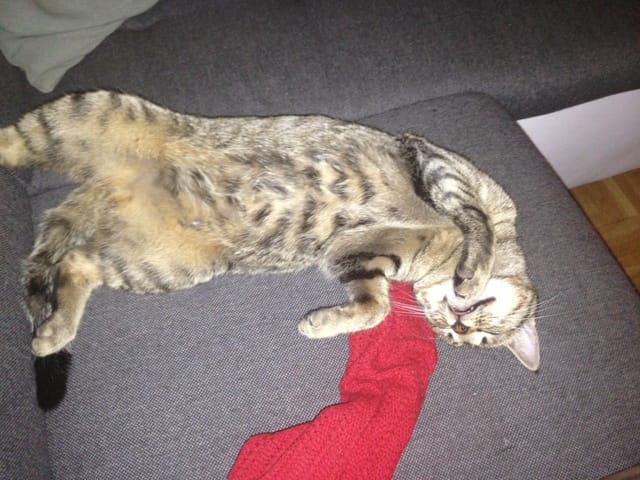 Très pot de colle a demander des câlins et à me suivre partout même aux WC alors qu'avant jamais elle n'avait fait ça! Ses mamelles m'ont l'air grosses et très roses alors qu'avant je ne les sentais pas sous ses poils en la caressant. Maintenant je les sens très très bien et je peux même les voir malgré ses poils! Son ventre m'a l'air dur et plus rond qu'avant. Réponse du véto : c'est très probable qu'elle soit gestante et que début août, des chatons arrivent.