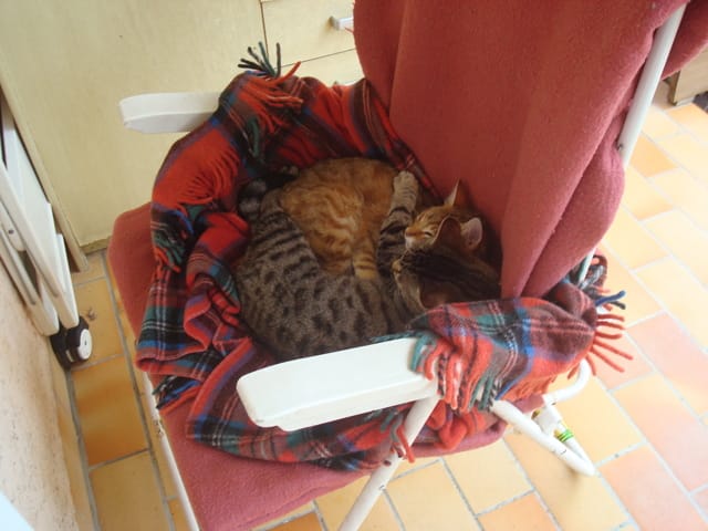 après plusieurs minutes à chercher comment insérer ma photo je suis contente du résultat oufff! nous habitions à 40kms d'Orléans avant de s'installer dans le sud, nous avions 3 chats footy sacrés de Birmanie, et deux européens,et quelques chats errants mais qui ne manquaient de rien. "couverts et gite" malheureusement footy, Moune et Caline on attrapés une infection dans la bouche par les pesticides que l'agriculteur passait dans nos champs.nous avons avec le véto essayer plusieurs traitements sans résultat,nous avons été obliger de les faire endormir trop de souffrances pour eux il ne pouvaient plus se nourrir. Nous avons beaucoup pleuré mon et moi c'étaient nos petits amours. Nous les avons enterré ensemble, "il y a 10 ans de cela" aujourd'hui j'ai Tinou( bientôt photo) Micha (le petit roux) et chaton(sauvage)son copain sur le fauteuil et trois autres chats errants que je nourris. quelques fois on se moque de moi (gentiment) 🙂 les résidents sont gentils bonne fin de journée à toi