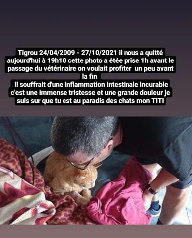 Il s'appelait Tigrou il avait 12 et 6mois il est décédés ce mercredi 27 octobre 2021 a 19h10 après injection avec le vétérinaire dans ça maison et dans sont arbre a chat accompagné de mon épouse et de mes enfants avec pleins de câlins et de bisous