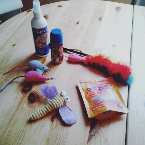 Donc pour commencer je vais très bien, toujours sur Vannes avec mes petites minettes. Kiara et Maïa vont très bien, elles ont reçu la wamiz box il n'y à pas longtemps, elles ont eu deux sachet fraîcheur, un sachet de friandises de poulet, un tube à l'huile de saumon (qu'elles adorent), une canne à pèche qu'elles aiment beaucoup, un petit jouet à la menthe à chat et un spray de menthe à chat (pour mettre sur tissus ou jouet). La box m'a bien plus, surtout pour 9.90€ !! Après je ne pense pas racheter parce que le prix normal reste assez cher !