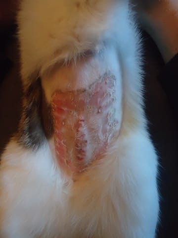 Oui ils ont rasé pour l'opération, là où c'est rouge c'est l'endroit où elle a eu l'allergie, maintenant c'est moins rouge mais à quelques endroit ça le reste un peu.