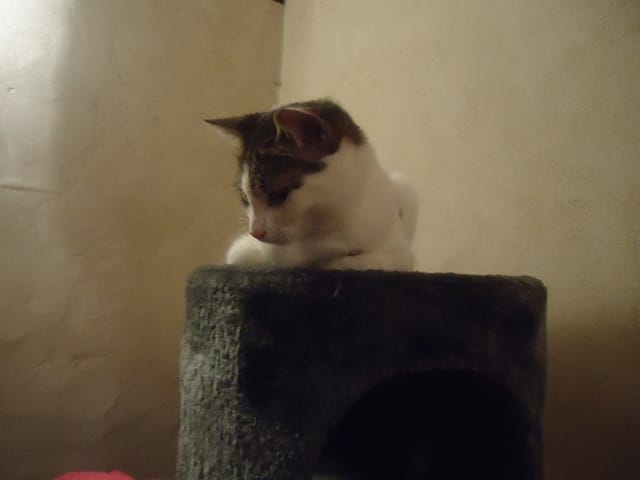Sur son arbre à chat en regardant Maïa :)