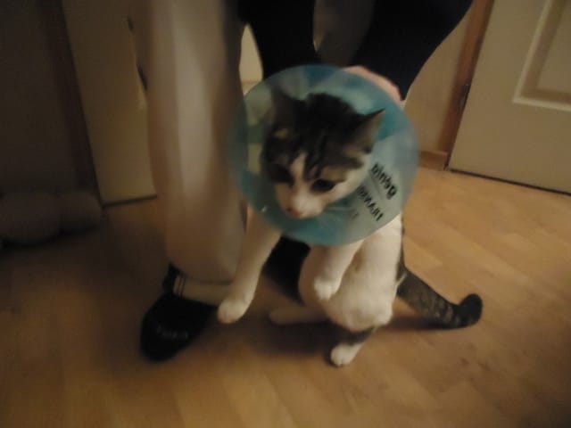Du coup elle à une jolie collerette bleu ! XD la pauvre mimine... Elle a du mal avec...