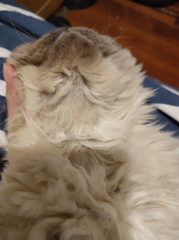 Ma Chatte Mia ce grattait avec insistance je les donc examiné et la surprise je viens de m'apercevoir qui lui manque énormément de poils sous la gorge .
