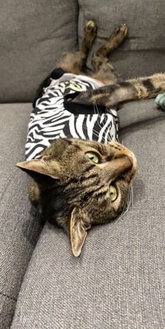 Mon chat kiwi a du se faire amputer de la patte avant droite ... mais voilà, comme si ce n’était pas assez, la peau autour de l’amputation s’est nécrosée (certainement dû à l’eczéma de stress qui avait commencer à developer chez le vétérinaire ou/et à cause des toxines présentes dans sa patte avant amputation)