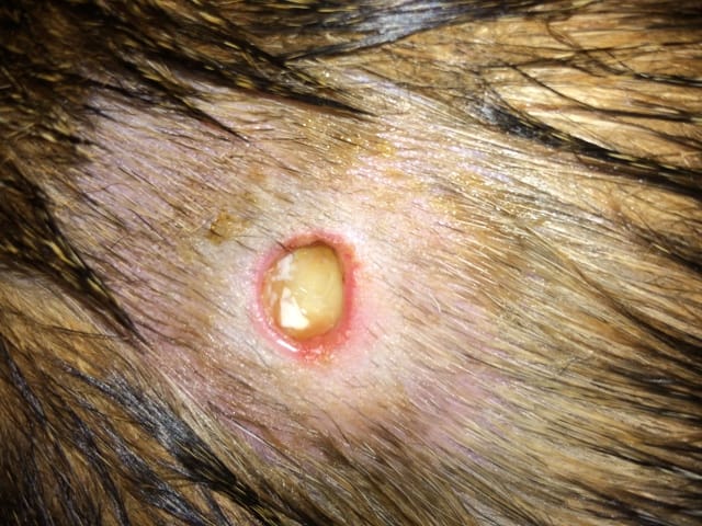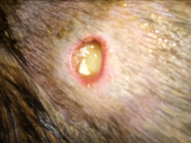 Sauf que ce matin quand je me lève pour nettoyer et lui remettre de la crème, la plaie est vraiment moche ! pleins de truc jaune...je m’inquiète mais je ne peux pas me permettre de retourner chez le vétérinaire encore une fois ce mois ci.