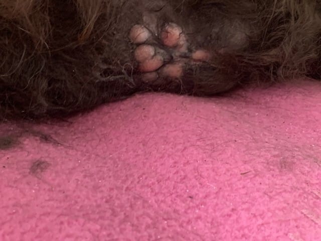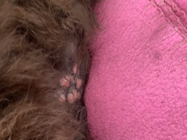 Et bien , la semaine dernière je l'ai brosser, et elle n'avait rien .Et elle n'aime pas qu'on touche son ventre donc cette semaine je n'ai rien vu juste qu'a la je l'ai brosser et j'ai vus ca...