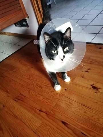 Hier mon gros chat est revenu avec un gros abcès au niveau des fesses, sûrement suite à une bagarre. Ni une ni deux, j'appelle mon veto qui me donne rendez-vous pour ce matin. J'ai amené mon chat ce matin, qui dans la nuit, avait réussi à percer l'abcès et à enlever presque tout le pus. La veto me l'a gardé pour la journée, l'a endormi car, dit-elle, il restait trop de pus à l'intérieur. Je l'ai récupéré en fin d'après-midi, elle me dit qu'elle a agrandi les trous pour faire sortir le pus. Mon chat a une collerette, il le vit très mal et réussit quand même à lécher ses plaies. Il a l'air d'aller relativement bien, mais a parfois des violents mouvements de queue et de pattes arrière, on sent que ça le gène terriblement et il se lèche compulsivement.