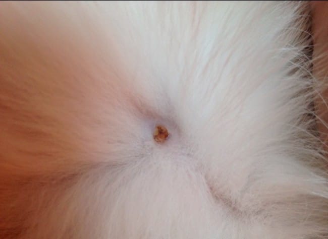 Je me suis inscrite sur ce site car j'ai remarqué quelque chose de bizarre sur Kitty: un assez petit trou dans sa peau avec quelque chose qui en ressort (solide) - voir photo. J'ai cru en l'appercevant que c'était un tique, mais vu de plus près, j'ai bien remarqué que s'en était pas un...