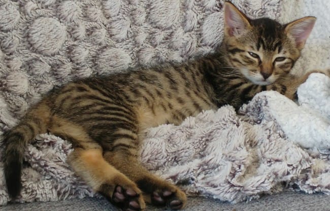 Brown spotted tabby, poils courts. Le marquage reste à vie, en revanche la couleur peut foncer en grandissant. Le 'M' sur le front est typique du gène tabby. Il est magnifique.