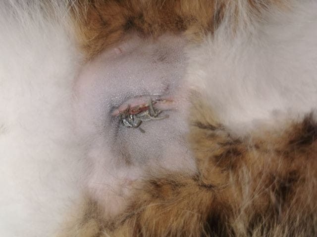 Première photo: sa cicatrice hier, je la trouvais un peu rouge donc je l'ai envoyé à mon vétérinaire qui associée à un comportement normal, et le fait qu'elle porte une collerette pour éviter les léchages à dit qu'il n'y avait rien d'anormal et qu'il ne fallait pas toucher à la cicatrice (comme si j'aurais osé.. .)