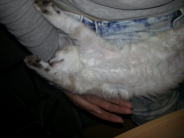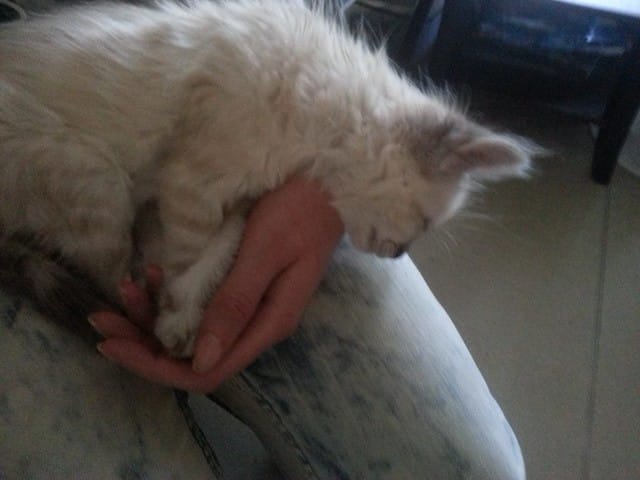 Quand il est arrivé, il était tout blanc, avec juste du brun sur la queue, les oreilles, et autour des yeux. Puis avec le temps, sa couleur est devenue crème, ses yeux ont foncés... puis il est aujourd'hui tout brun ! Sauf sur le plastron et le bidou!