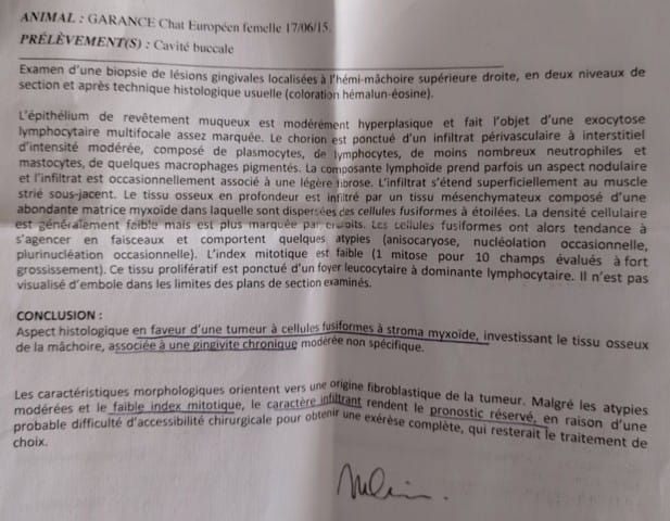 Mon chat de 6 ans (une femelle prénommée Garance) a contracté une tumeur bucale, située sur la gencive.