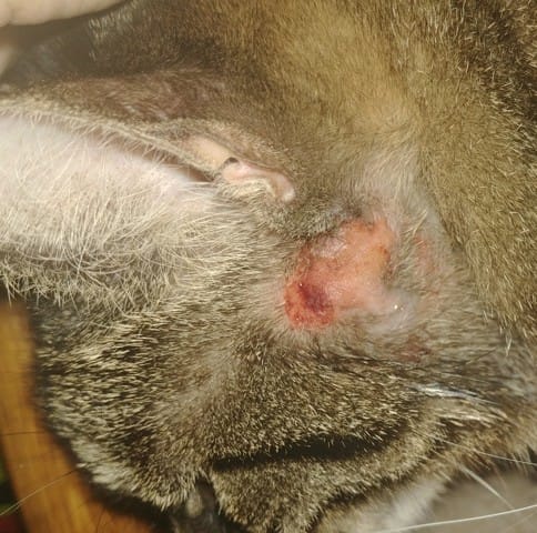 Bonjour à tous! Alors voilà je voudrais des avis en attendant de pouvoir emmener Zelda chez le vétérinaire. Il y a une semaine, une sorte de plaque rouge est apparue au niveau de sa machoire sous l'oreille, toute ronde et les poils sont tombés. Je lui ai mis sa collerette pour qu'elle ne gratte pas, mais elle a quand même réussi et la lésion s'est étendue et saigne un peu. Je désinfecte tous les jours. Je ne peux pas l'emmener avant la semaine prochaine et je m'inquiète un peu. Je pensais à une piqûre d'insecte, je n'ai aucune idée de ce que cela peut être. Merci pour vos réponses!